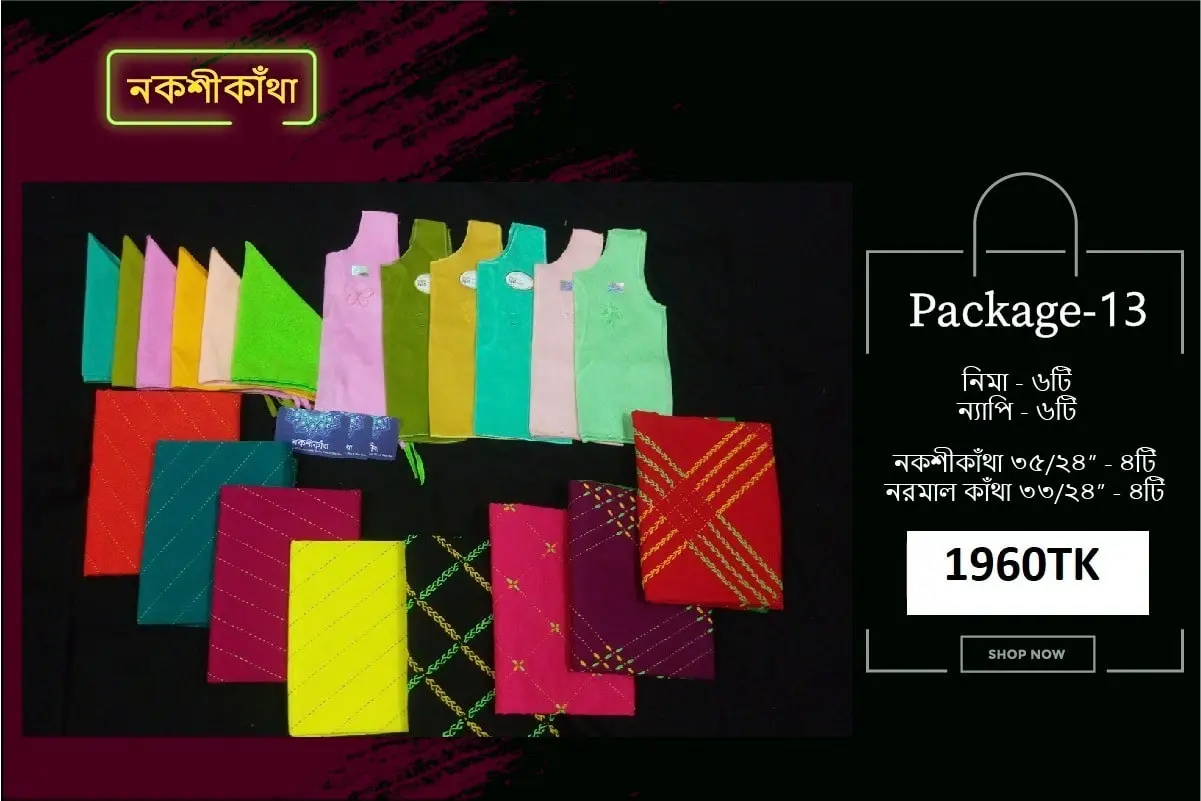 | ৩ | নকশীকাঁথা | ৩৫/২৪ ইঞ্চি | ৪টি | ২৫০ টাকা | ১০০০ টাকা |