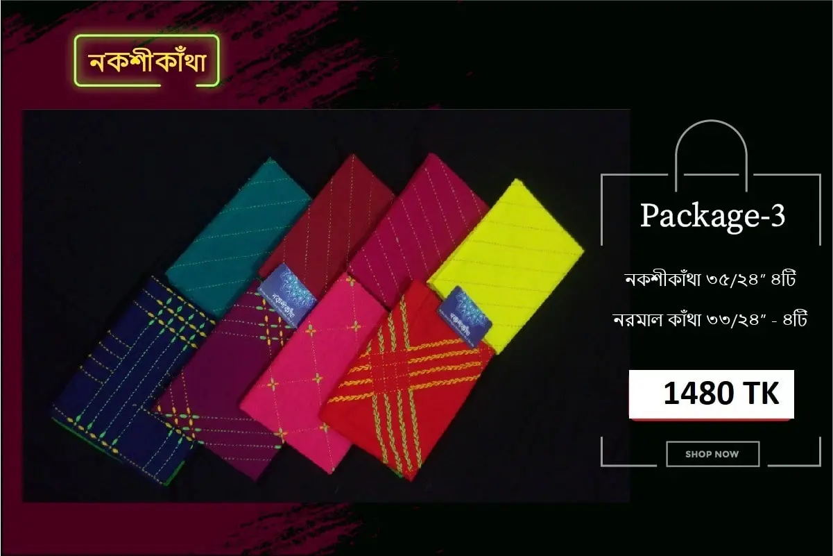 | ২ | নরমাল কাঁথা | ৩৩/২৪ ইঞ্চি | ৪টি | ১৮০ টাকা | ৭২০ টাকা |