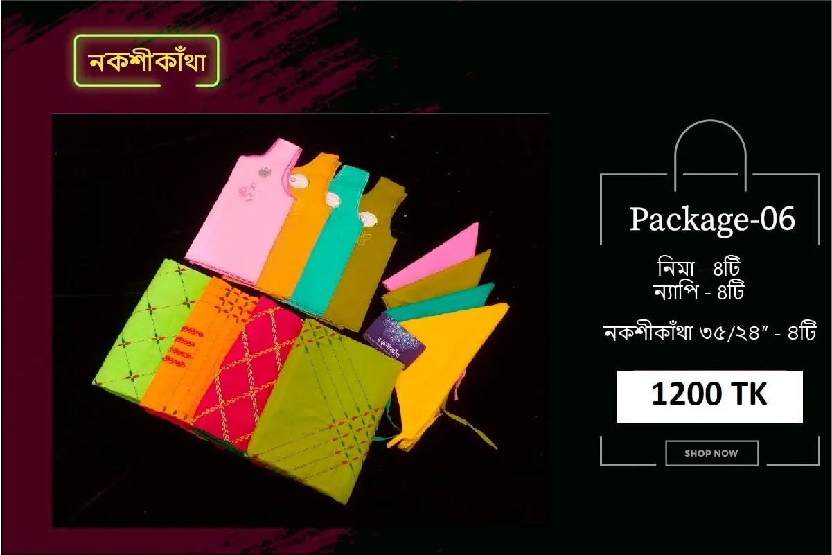 | ৩ | নকশীকাঁথা | ৩৫/২৪ ইঞ্চি | ৪টি | ২৫০ টাকা | ১০০০ টাকা |
